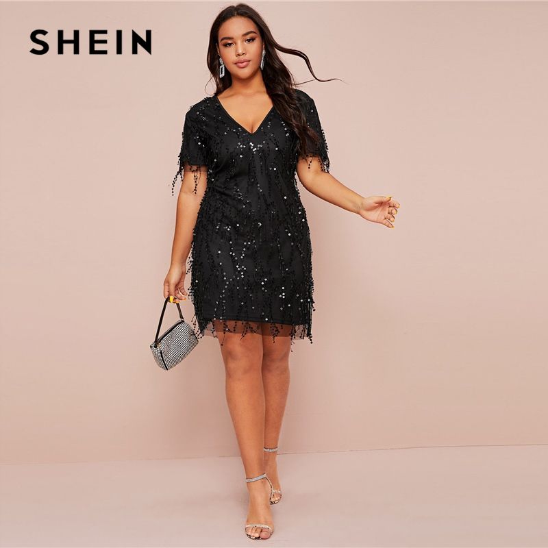 Shein Plus Size Glamorous Contrast Sequin Fitted Dress Women Spring Short Sleeve Deep V Neck Solid A Line Sexy Short Dresses From Qingshuixuan 100 51 Dhgate Com